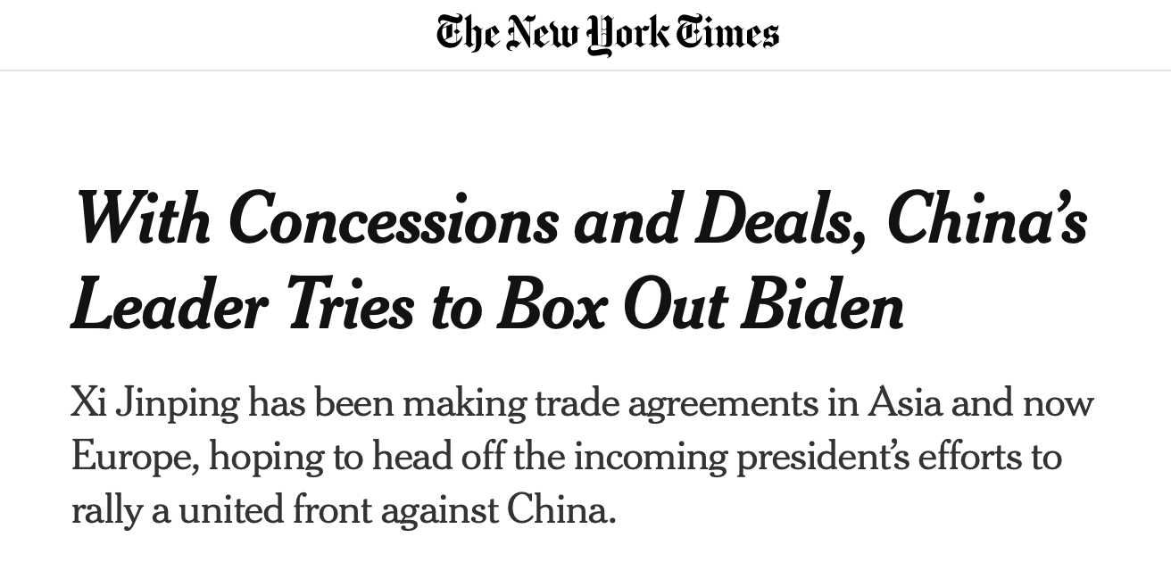 In the last two months, basically during the US election, China has concluded two hugely significant trade deals RCEP and the China-EU investment deal. Both of these have been under discussion for a significant time. How significant is the timing of these deals, one just days after the EU concluded its BREXIT negotiations. the two could be seen as a proactive strategy to undermine the new 2021 Biden administration’s attempts to build stronger coalitions to limit China’s power and influence and pressure the country to accepting a US-led package of trade and economic reforms.