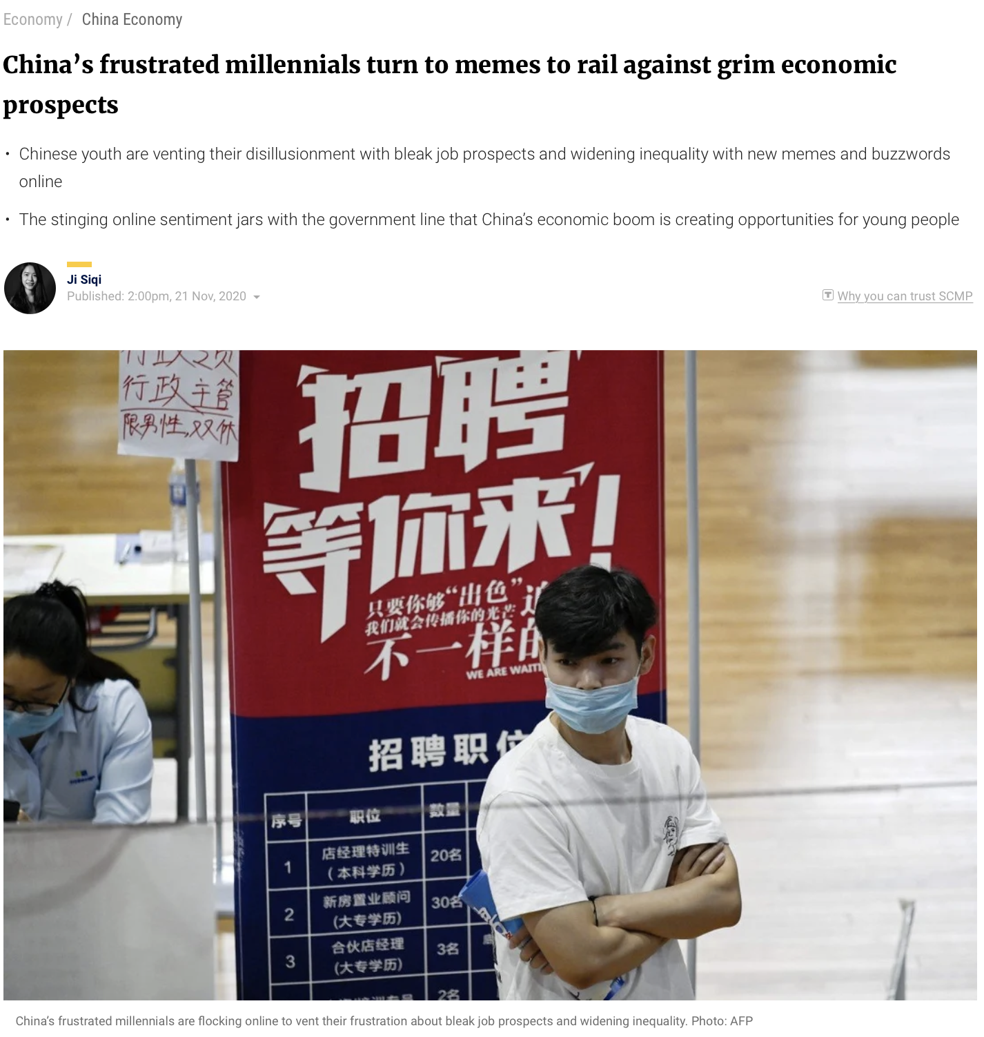 “In the text we have translated here, Liu focuses on China’s online generations, those born in the 1990s and 2000s, exploring and explaining their “unhappiness,” largely created by soaring real estate prices and uncertain employment prospects. Her specific focus is on the emotional response of these educated youth to this perspective of diminished expectations—or outright failure—as expressed through their online life, i.e., their creation and circulation of memes.